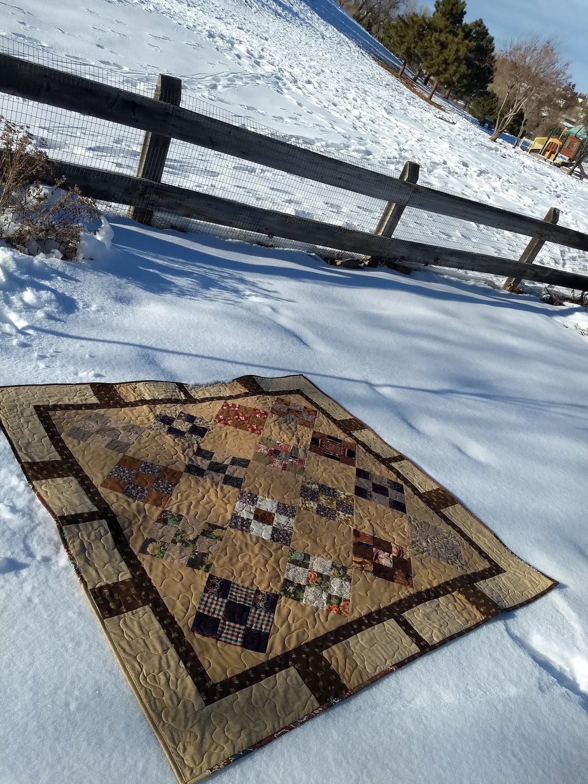 In mid 2018 I decided these scrappy nine patch blocks had languished for long enough! So I made a quilt top with them. It got quilted yesterday! And the snowy backdrop was perfect for a quilt finish photo!